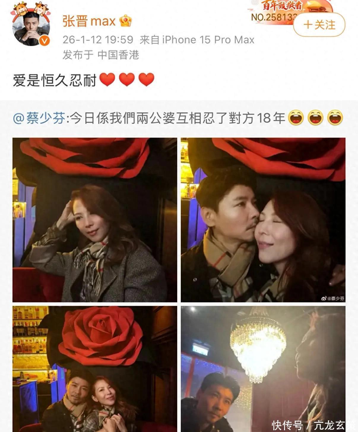 1月12日蔡少芬在社交平台晒出和老公张晋庆祝结婚18周年纪念日的照片,并配文“今日是我们俩公婆互相忍了对方18年”,随后张晋转发表示“爱是恒久忍耐”。
